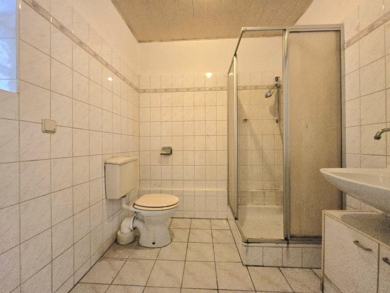 - Duschbad mit kleinem Fenster und Waschmaschinenanschluss
