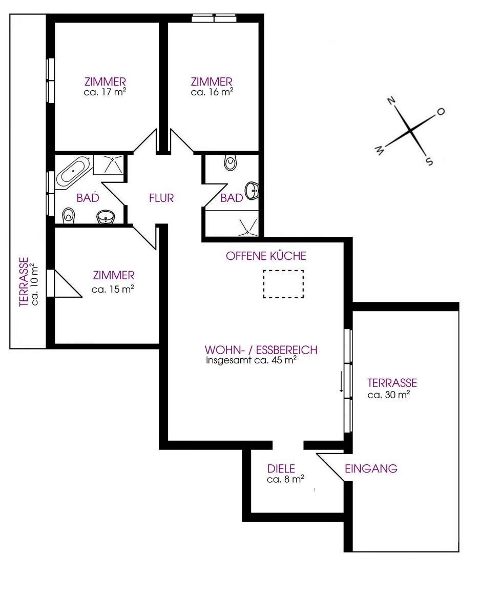 - geräumige Zimmer (ca. 17 m², ca. 16 m² und ca. 15 m²)